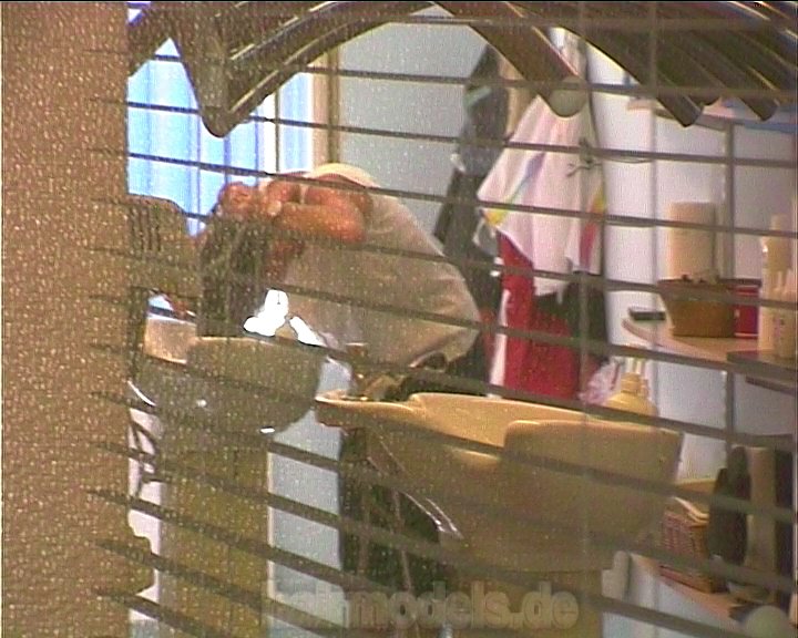 A lone in a row. Barberette self shampooing in salon. Standing position, bend over forward over forward bowl