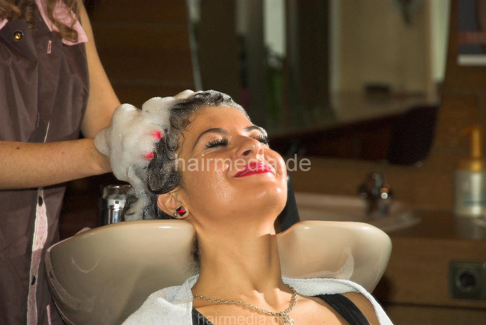 1014 1 Alina in boots and leatherpants by Aida in Nylonkittel backward salon shampooing