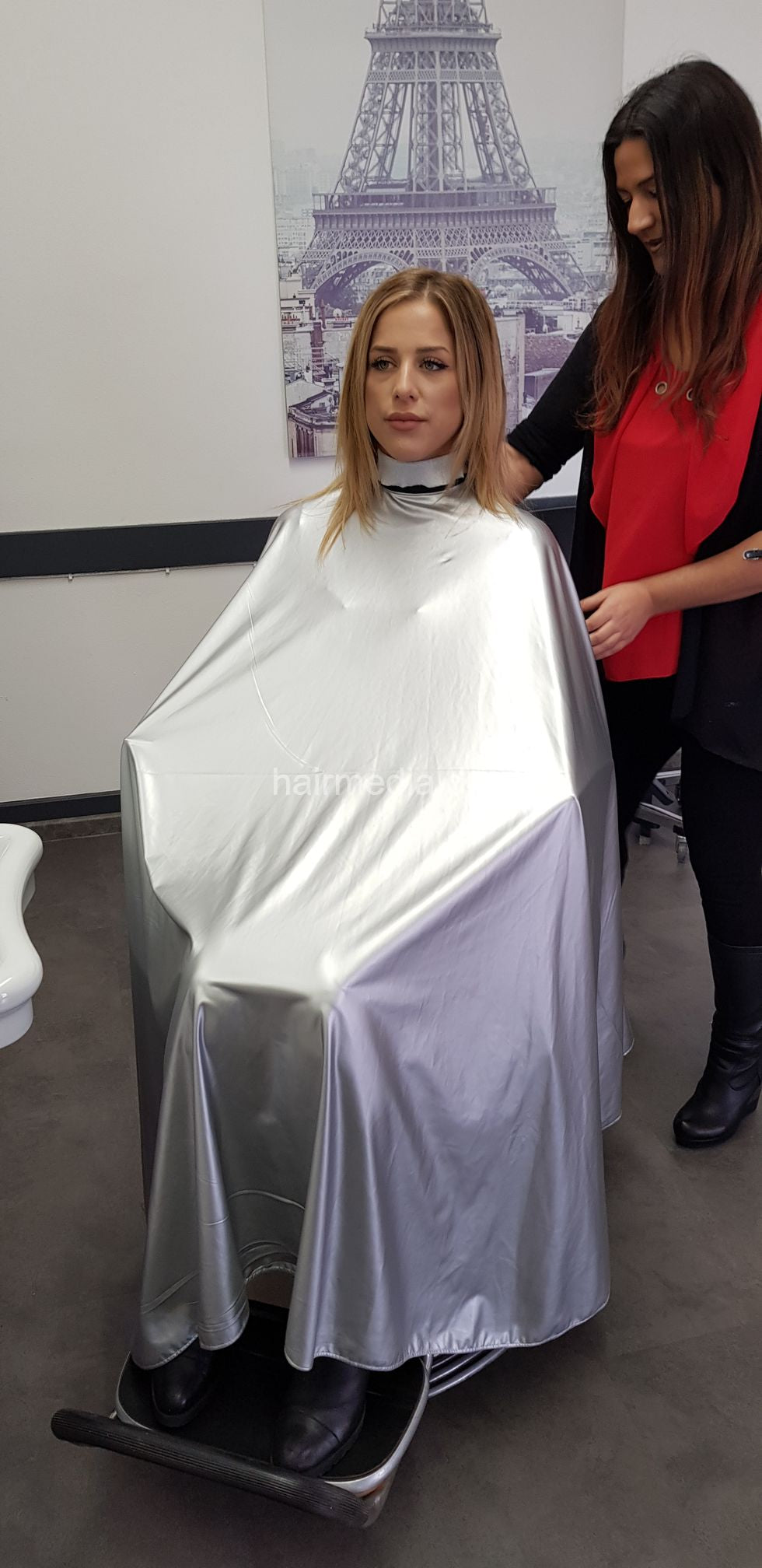Caping session in really old vintage barbershop and barberchair in Frankfurt/Germany. Using lots of very large and very heavy unique capes, velcro- and tieclosure. Genuine barberettes caping each other.