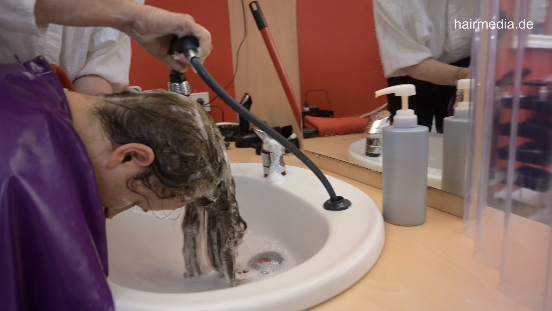 1175 HannaM 1 faked perm forward wash salon shampooing in pink PVC cape