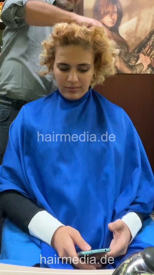 1246 Barberette Nora in apron curly hair forward shampooing by barber vertical video
