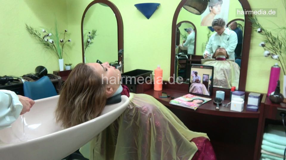 1254 Nora 2 shampooing by LisaMW in curlers and white apron, multicaped