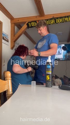 Friseur Mike may be known for his bold style, but at home, he takes on a different role. He lovingly washes his wife's hair in the comfort of their bathroom. Picture this: her head tilted forward over the sink, her vibrant red hair cascading down.