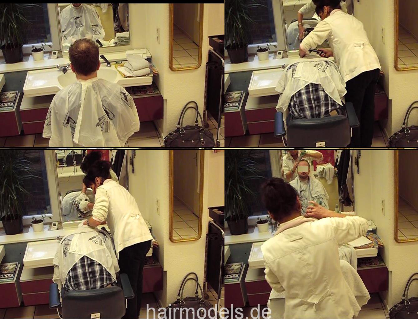 257 s1772 male client firm 2x wash and massage by mature barberette in white apron