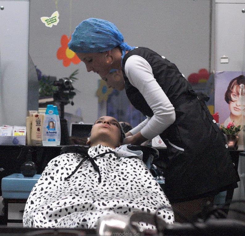 0003 CarmenK shampooing in tie closure shampoocape by barberette in rollers
