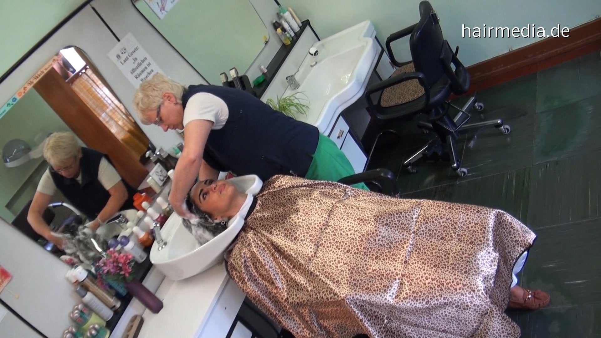 368 FatmaY by barberette in tiger cape long black hair salon backward washing