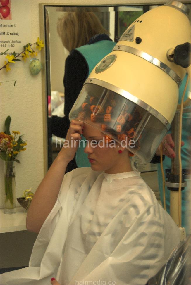 6104 Lena 3 wet set in vintage hair salon in vintage metal hood dryers