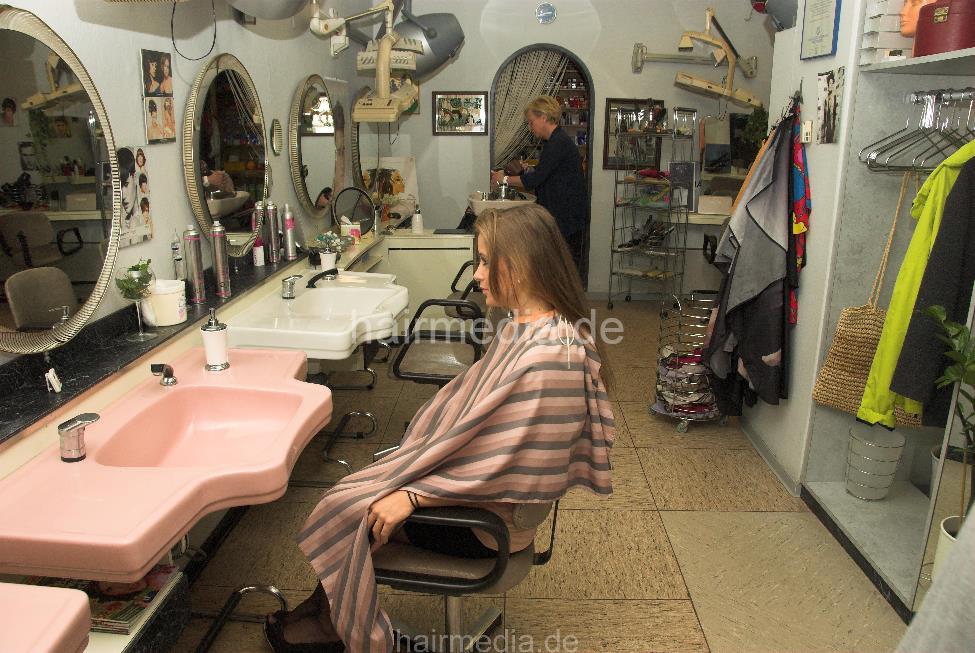 Veronika and Ellen dressed in skirt and nylons, ready for vintage party got shampoo and wetset in vintage hairsalon in Darmstadt. Mature barberettes did a strong and perfect job! Part 05 strong backward manner hair wash shampooing by milf apron barberette