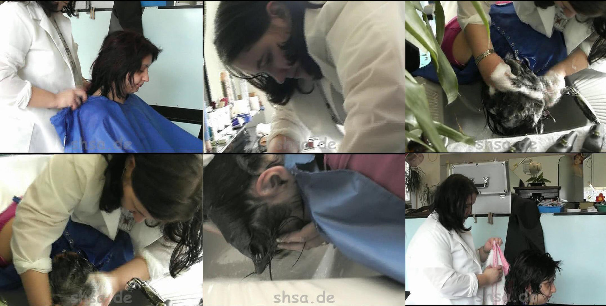 175 mature barberette Marion in white apron wash and haircut TRAILER